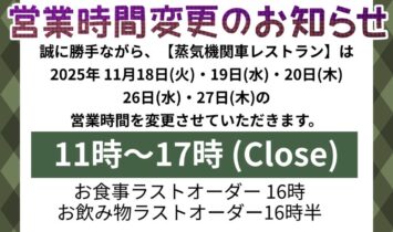 日頃より、ご利用いただき誠にありがとうございます。新型コロナウイルス感染拡大防止に伴い営業時間をSLランドミュージアム営業時間10:00~17:00とさせていただきます。…