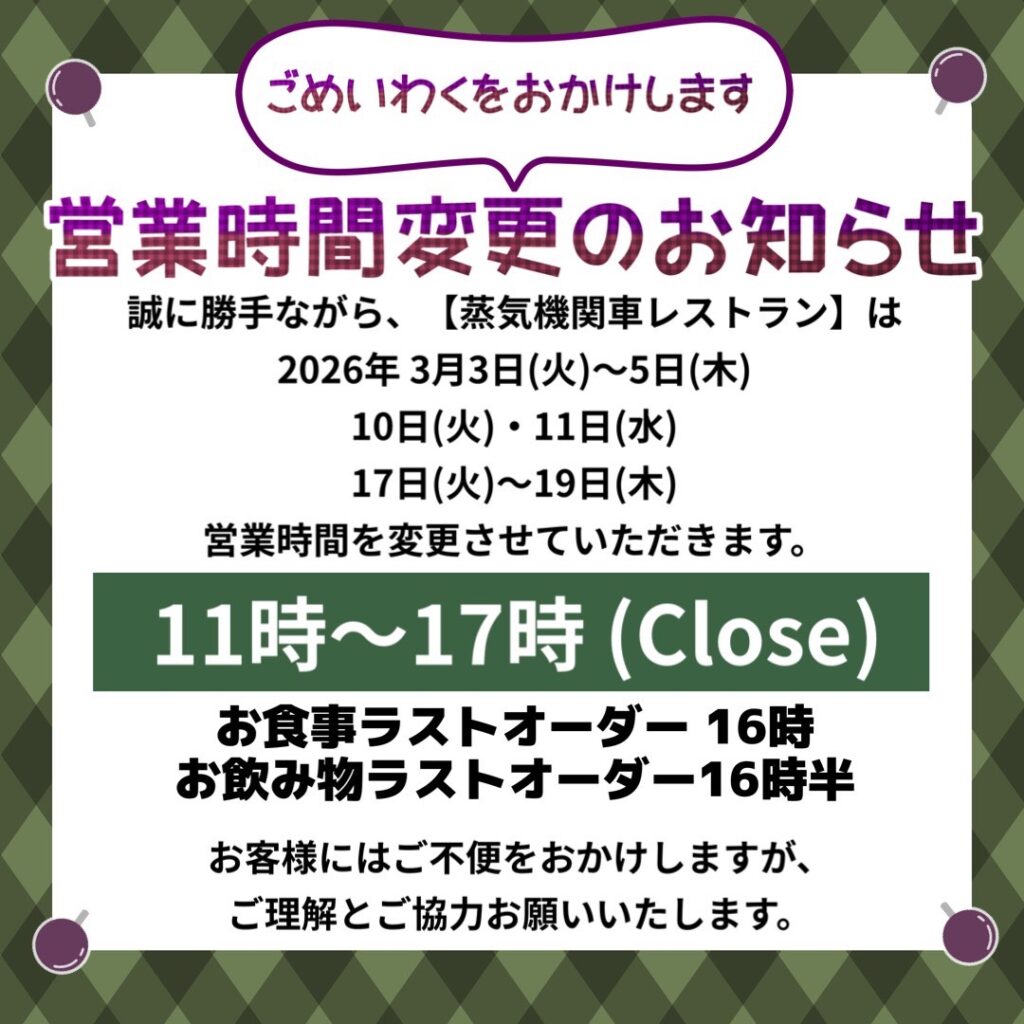 蒸気機関車レストラン営業時間変更のお知らせ